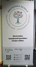 Damit betonen wir unsere tagtäglich schon in vielen Bereichen gelebten Werte Nachhaltigkeit, Gerechtigkeit, Solidarität, Gleichberechtigung und Gewaltlosigkeit und begeben uns auf den Weg, diese noch stärker in unserem Leben und Arbeiten umzusetzen. Diese universellen Werte sollen uns trotz und eben wegen unserer Verschiedenheit, zunächst im schulischen Rahmen und in Zukunft bis in die Gesellschaft hinein, eine Basis für ein friedliches und respektvolles Miteinander sein.