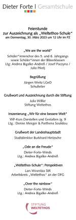 Rede anlässlich der Auszeichnungsfeier zur „Weltethos-Schule“ am Donnerstag, den 30. März 2023 um 12 Uhr im PZ von Studienrat Lars Wosnitza (Leiter des Arbeitskreises Weltethos)